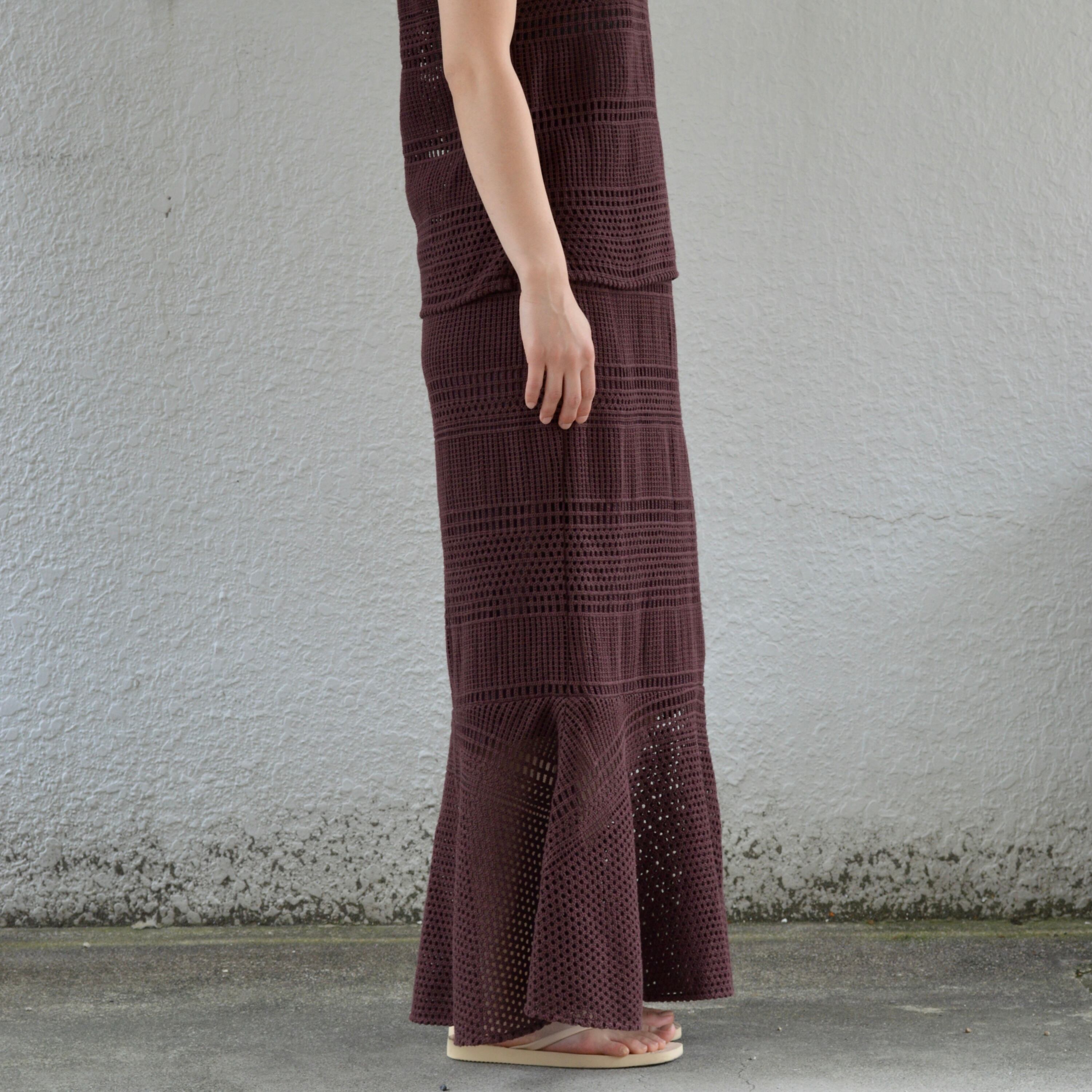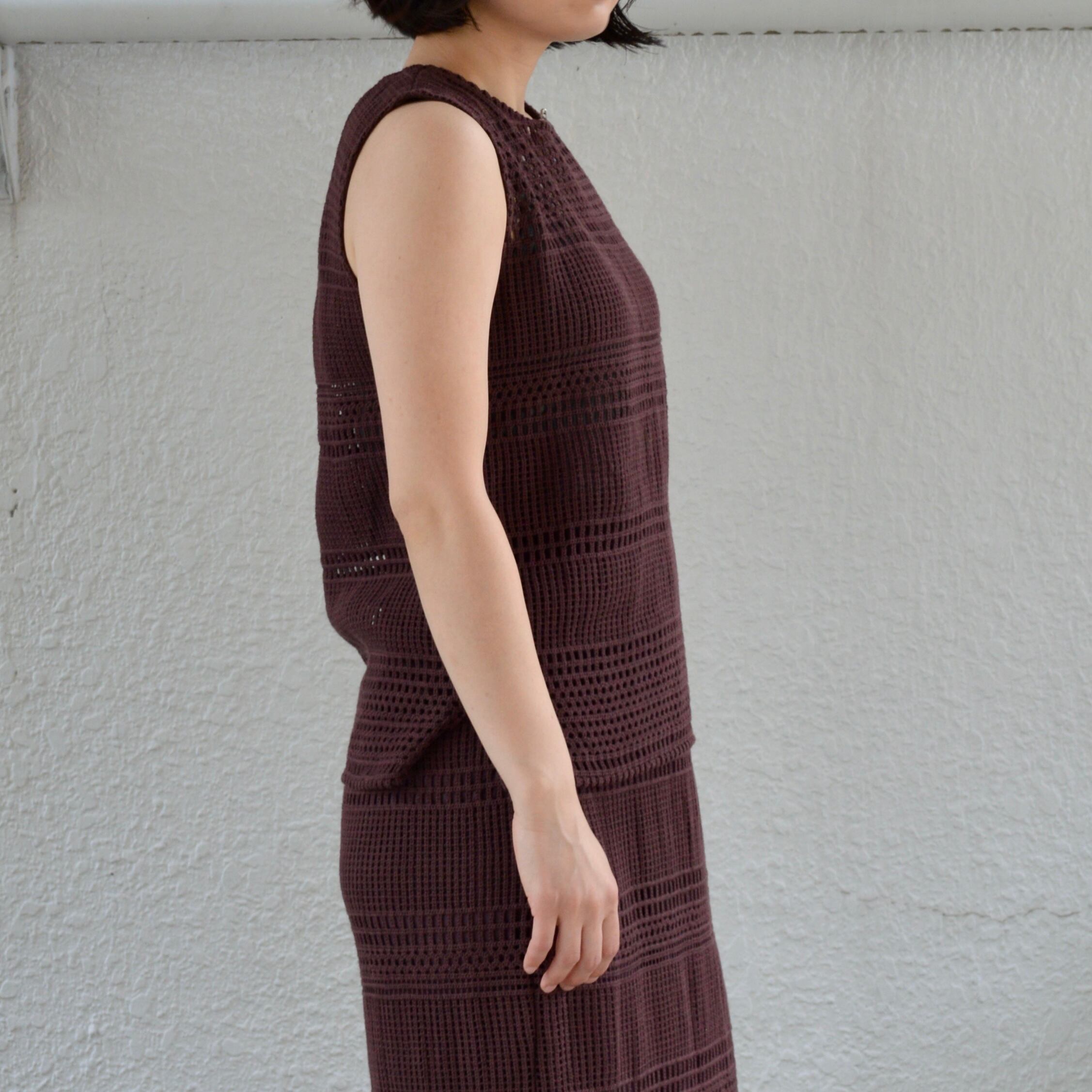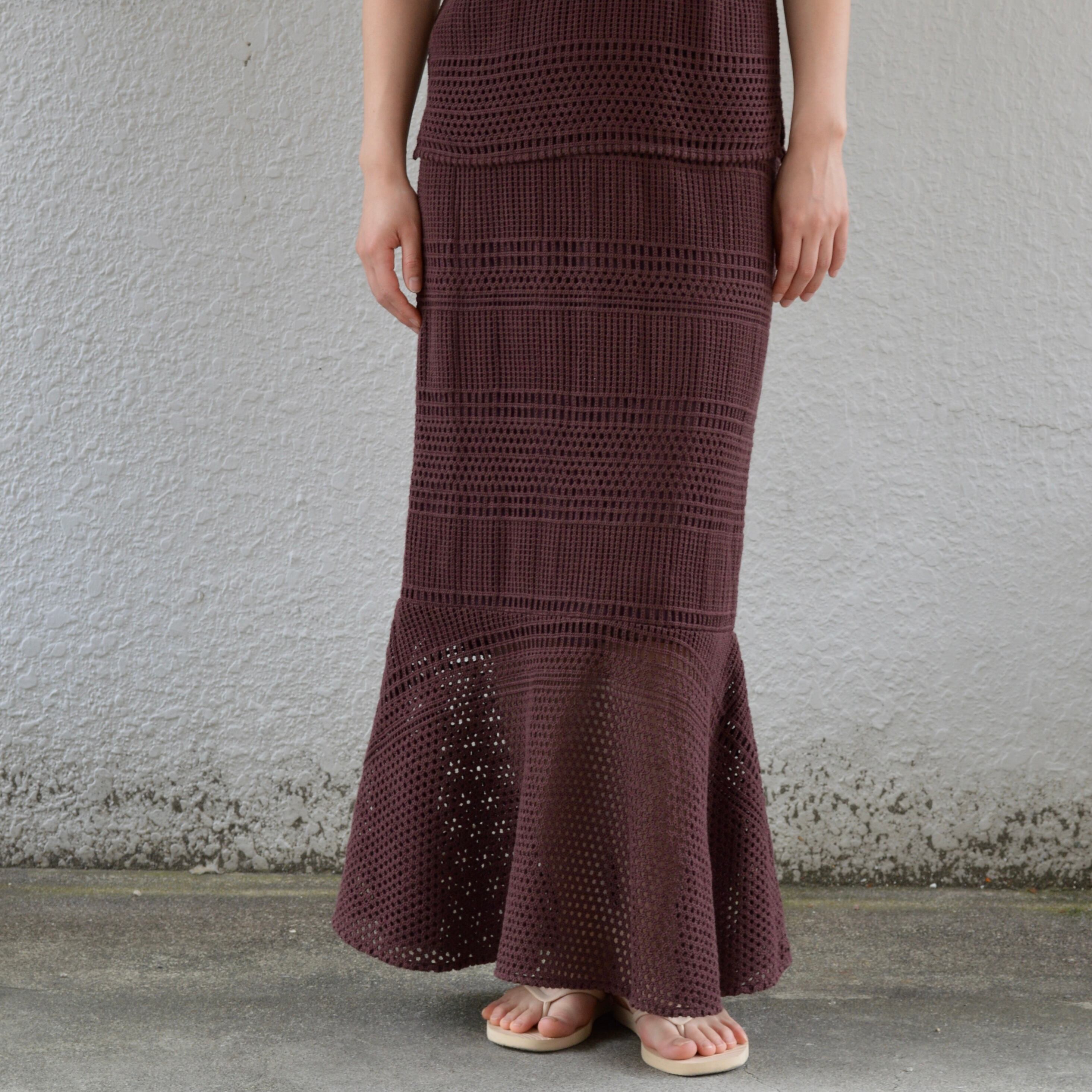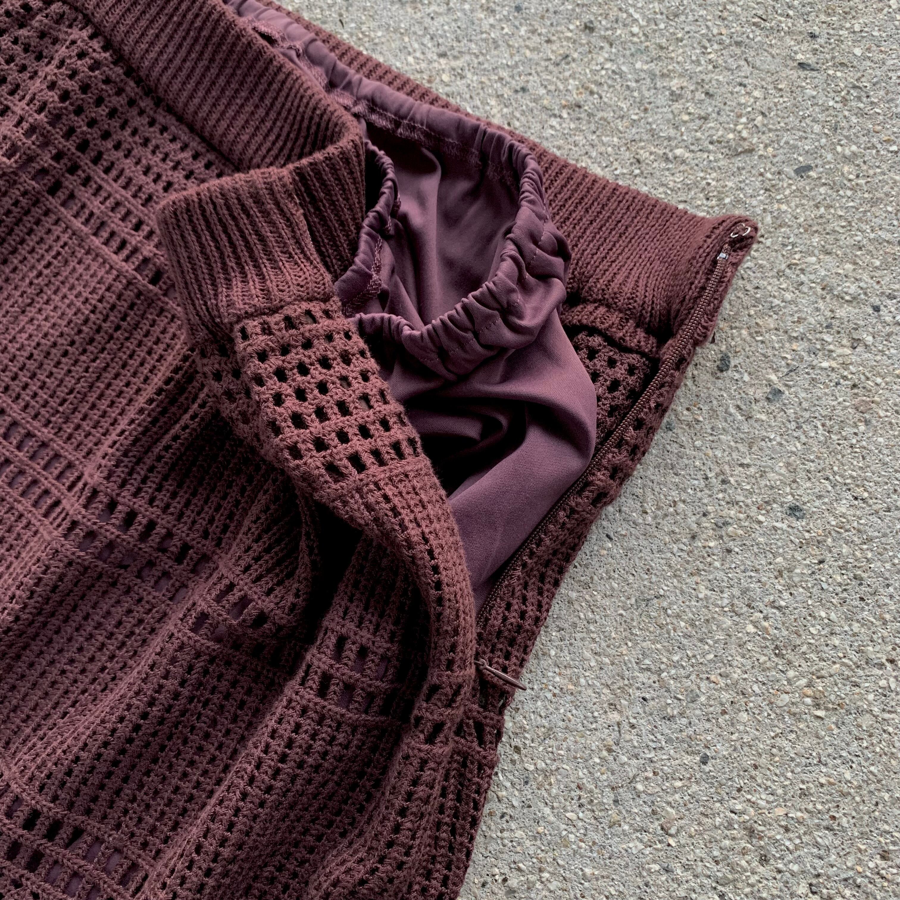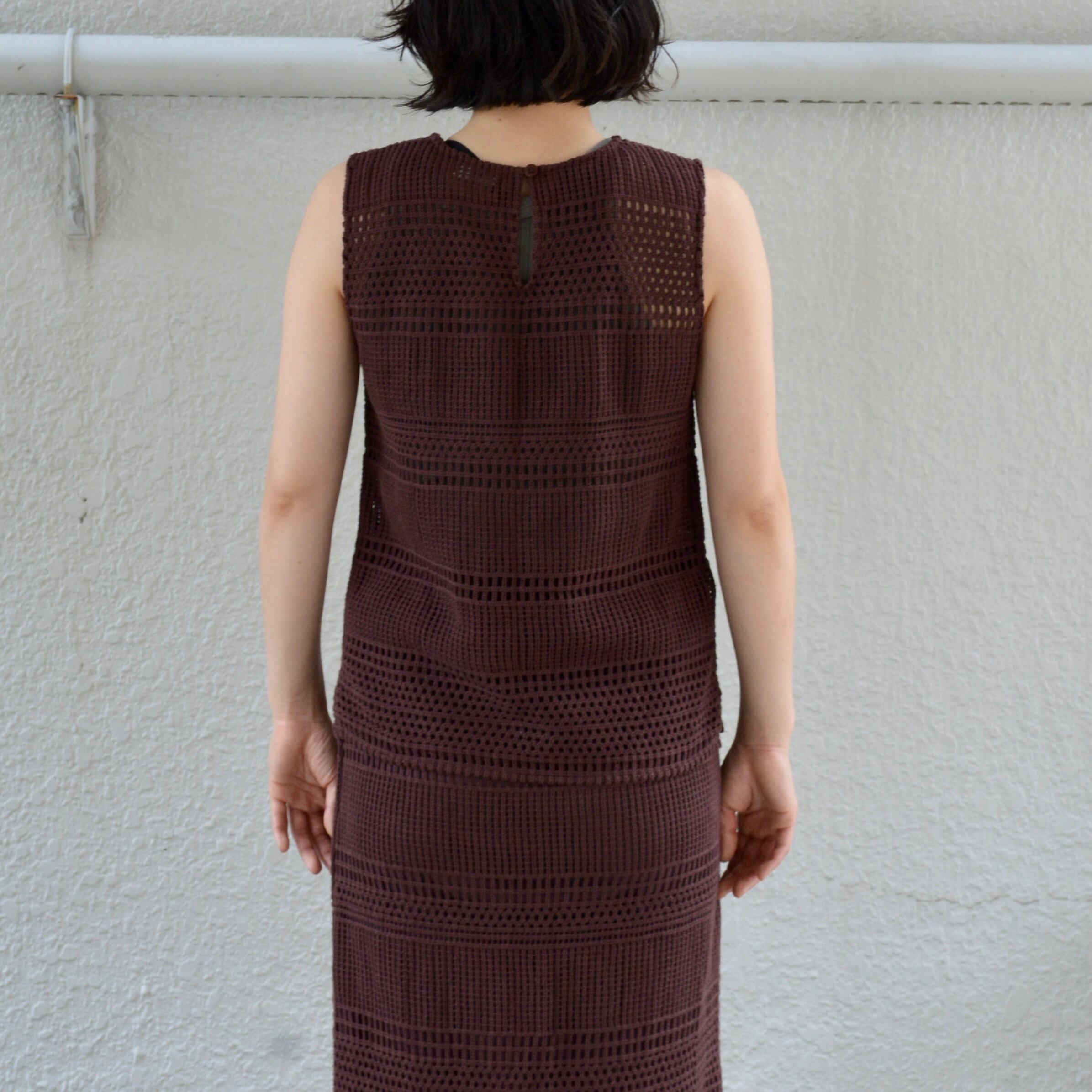 比較的目の詰まったカギ編みニットになり、秋や春先など過ごしやすい季節にほとんど対応できるニットセットアップアイテム。