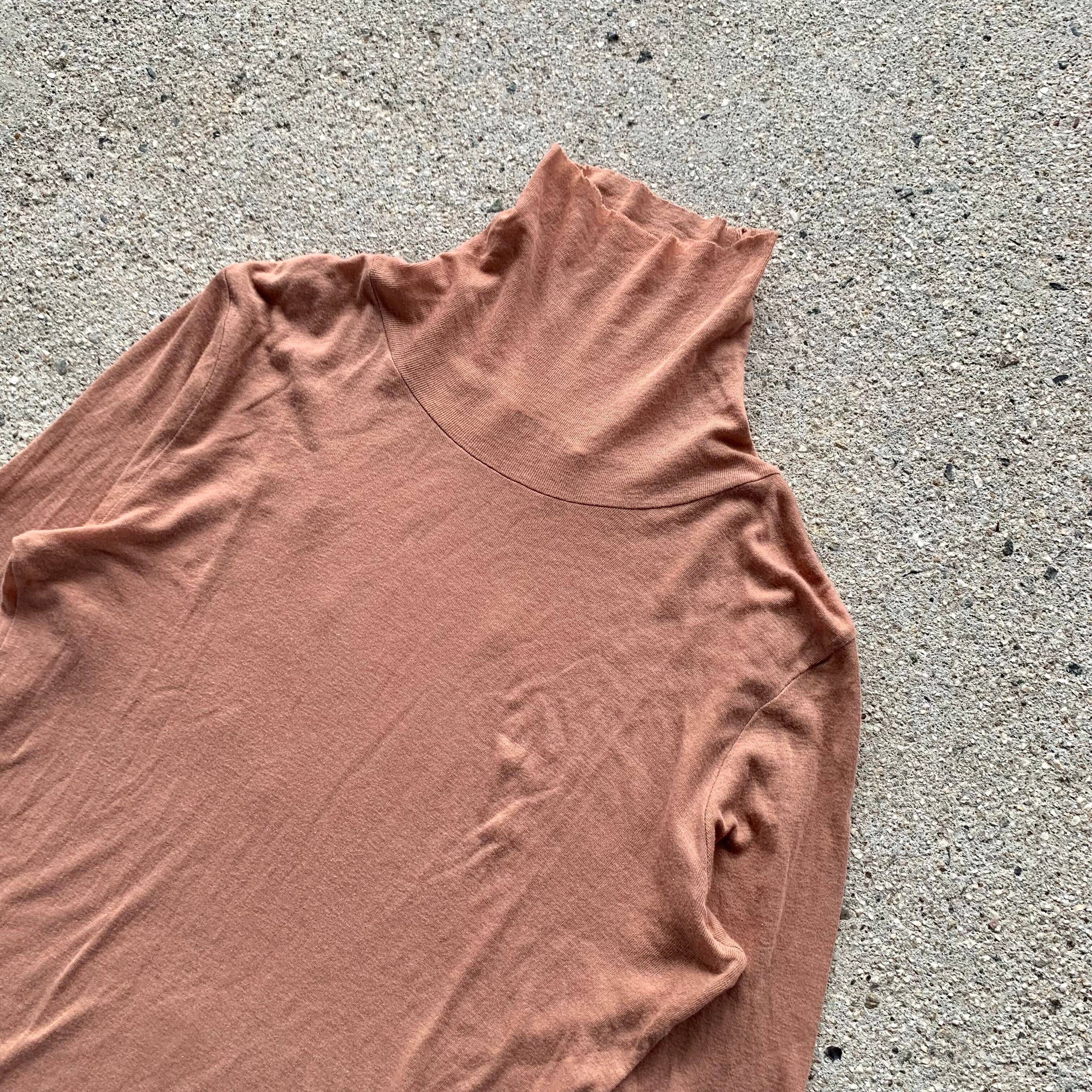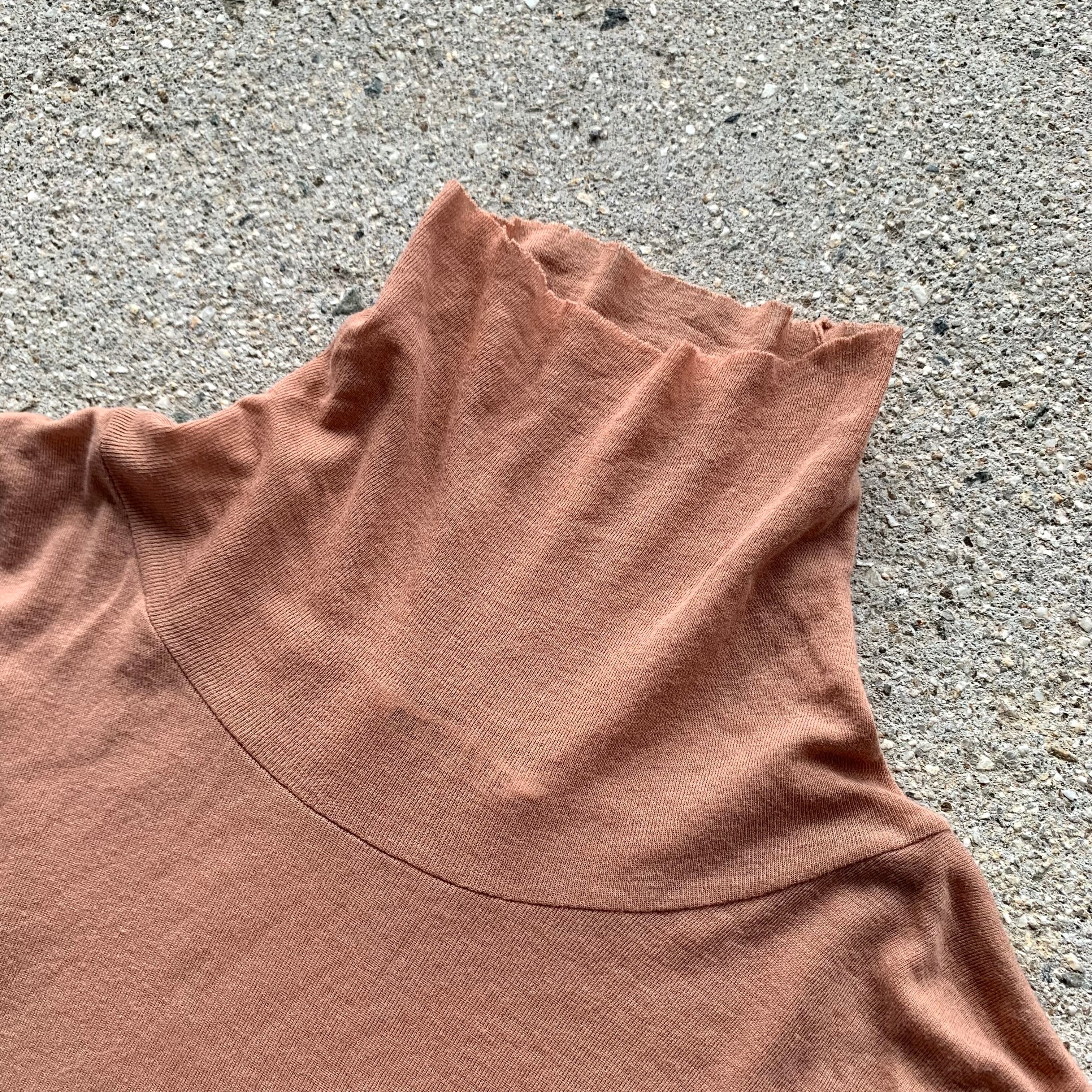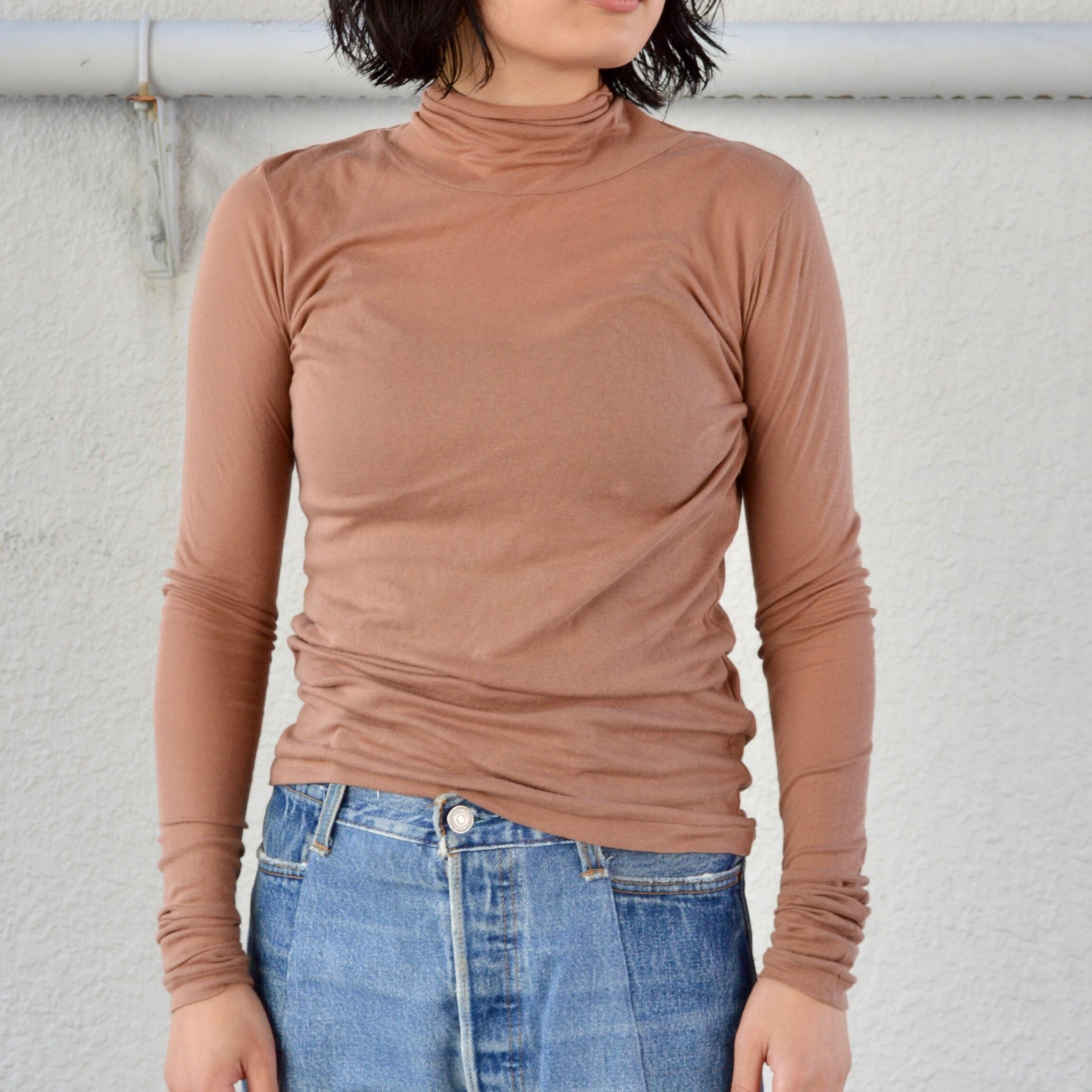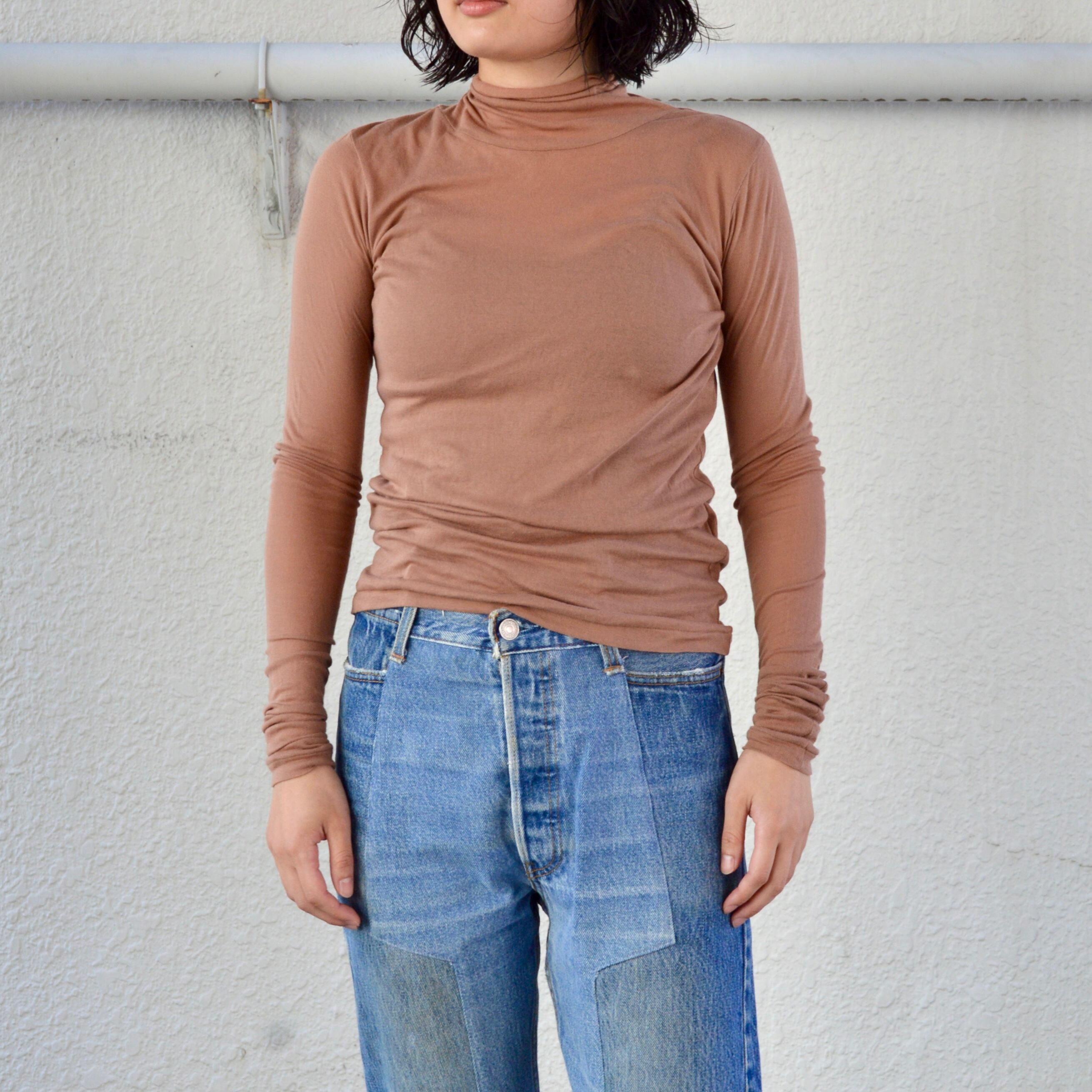 タートルネックは切りっぱなしのカットオフ仕様になり、裾口はビンテージアイテムにあるシングルステッチ縫製でつくられた身体のラインに沿うきれいなシルエットが特徴のハイネックです。