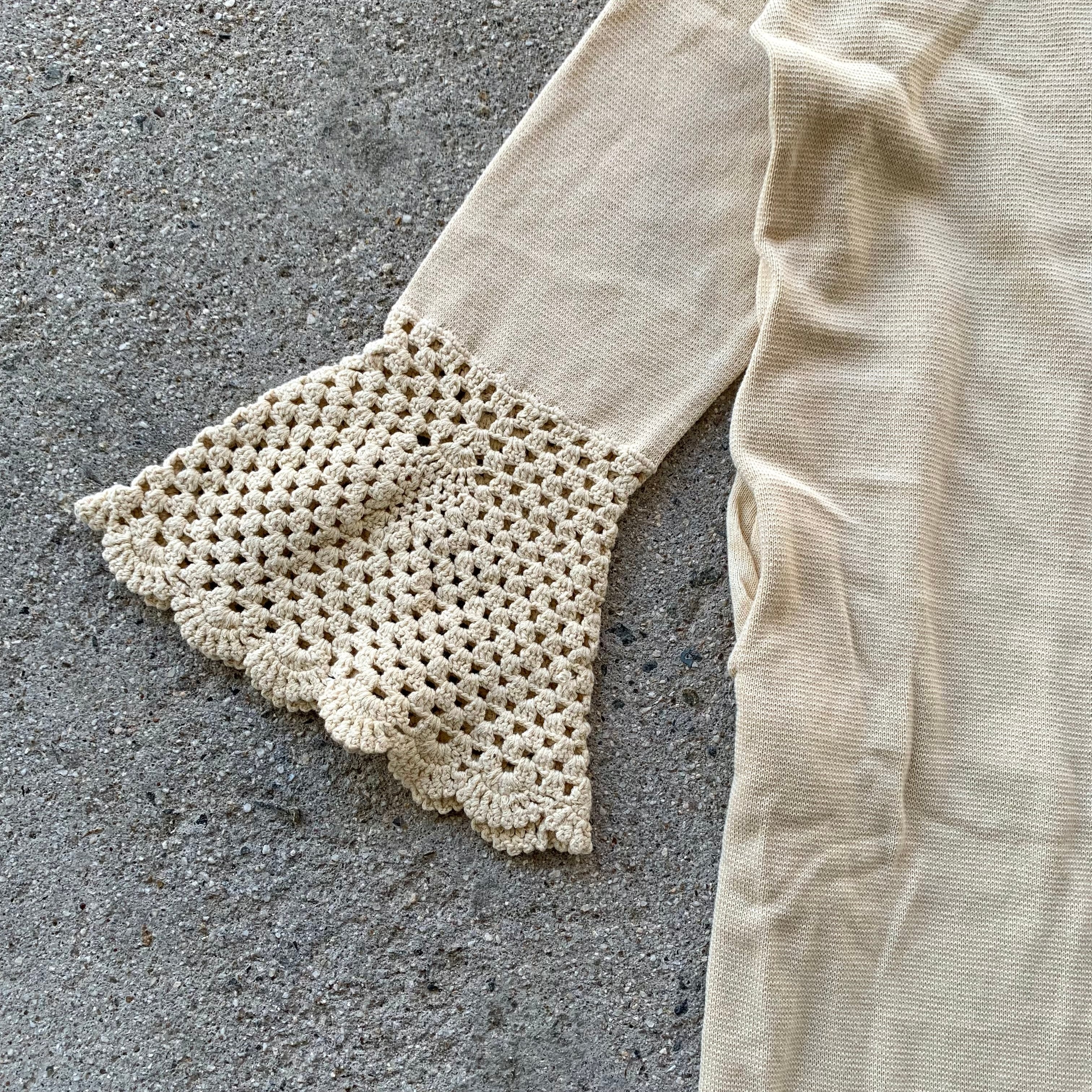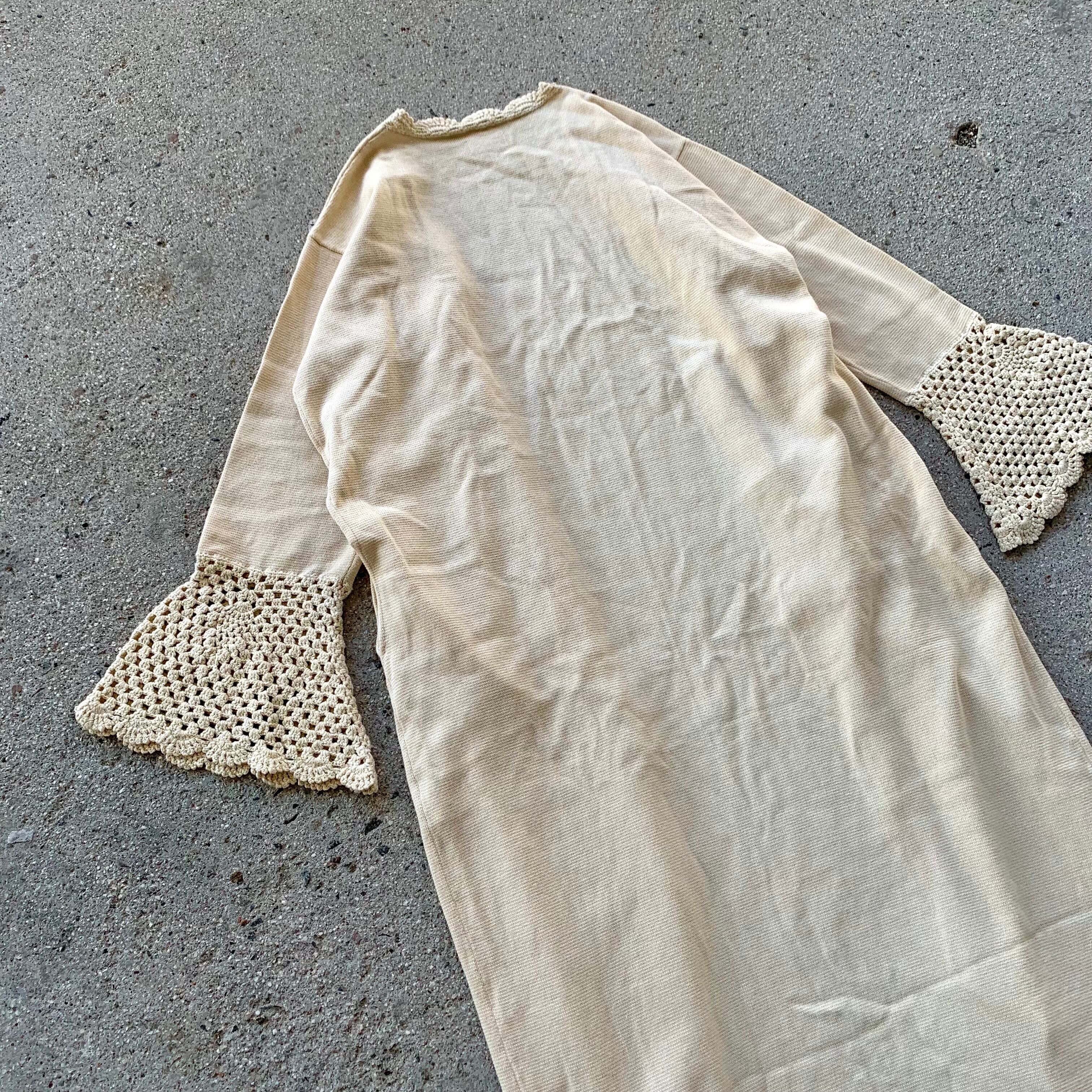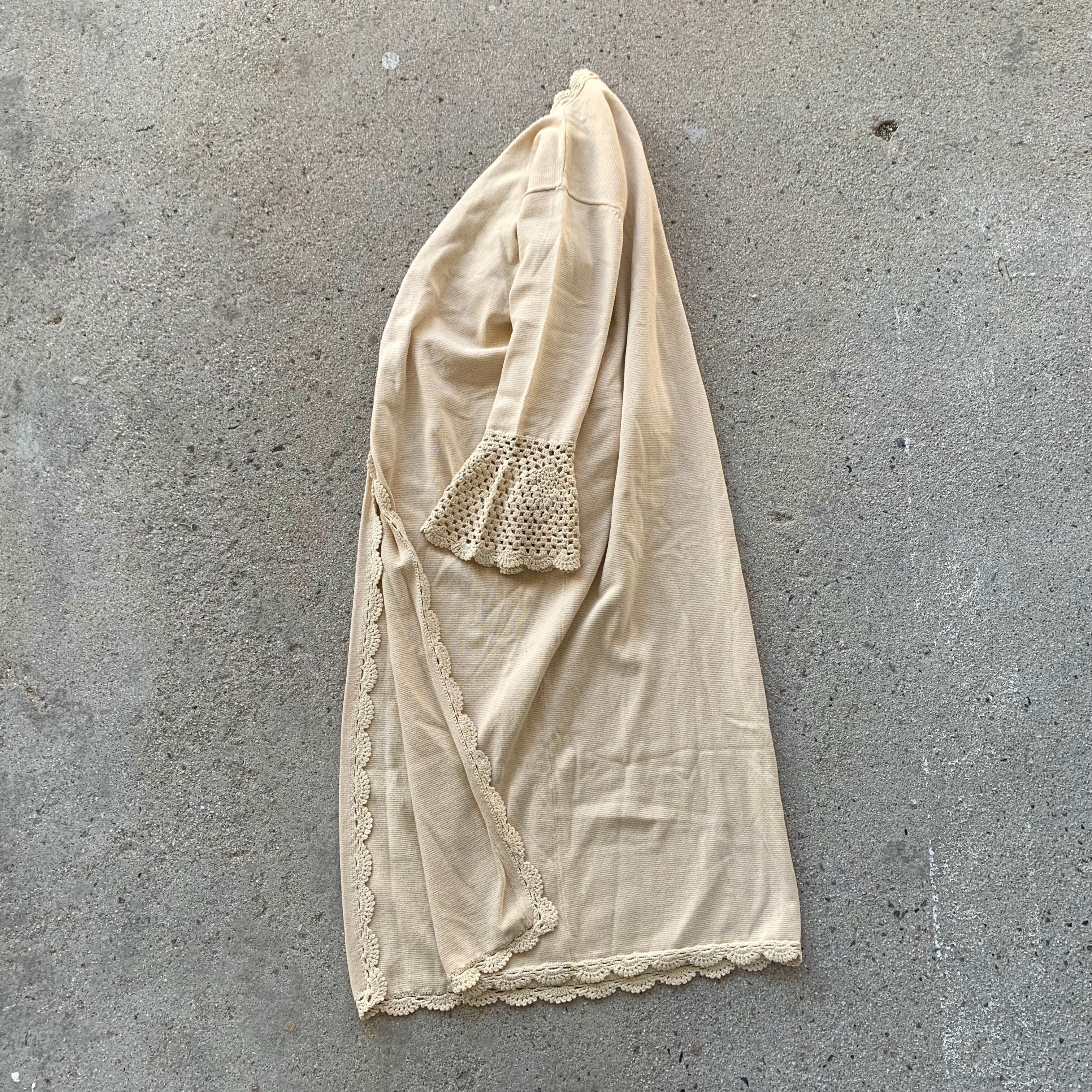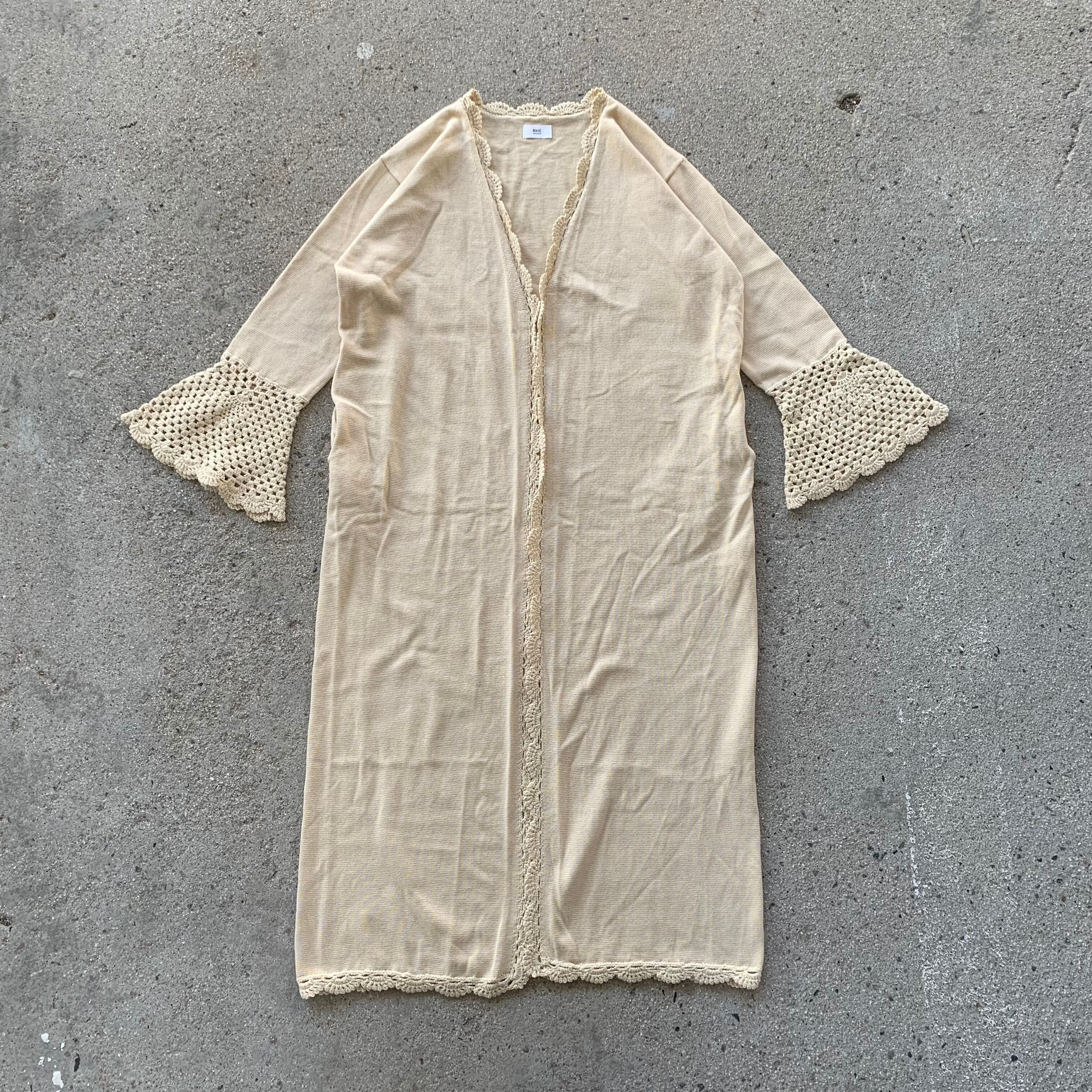 膝下まであるロングコットンニットカーディガンになり、裾口のレース編みデザインが特徴。
