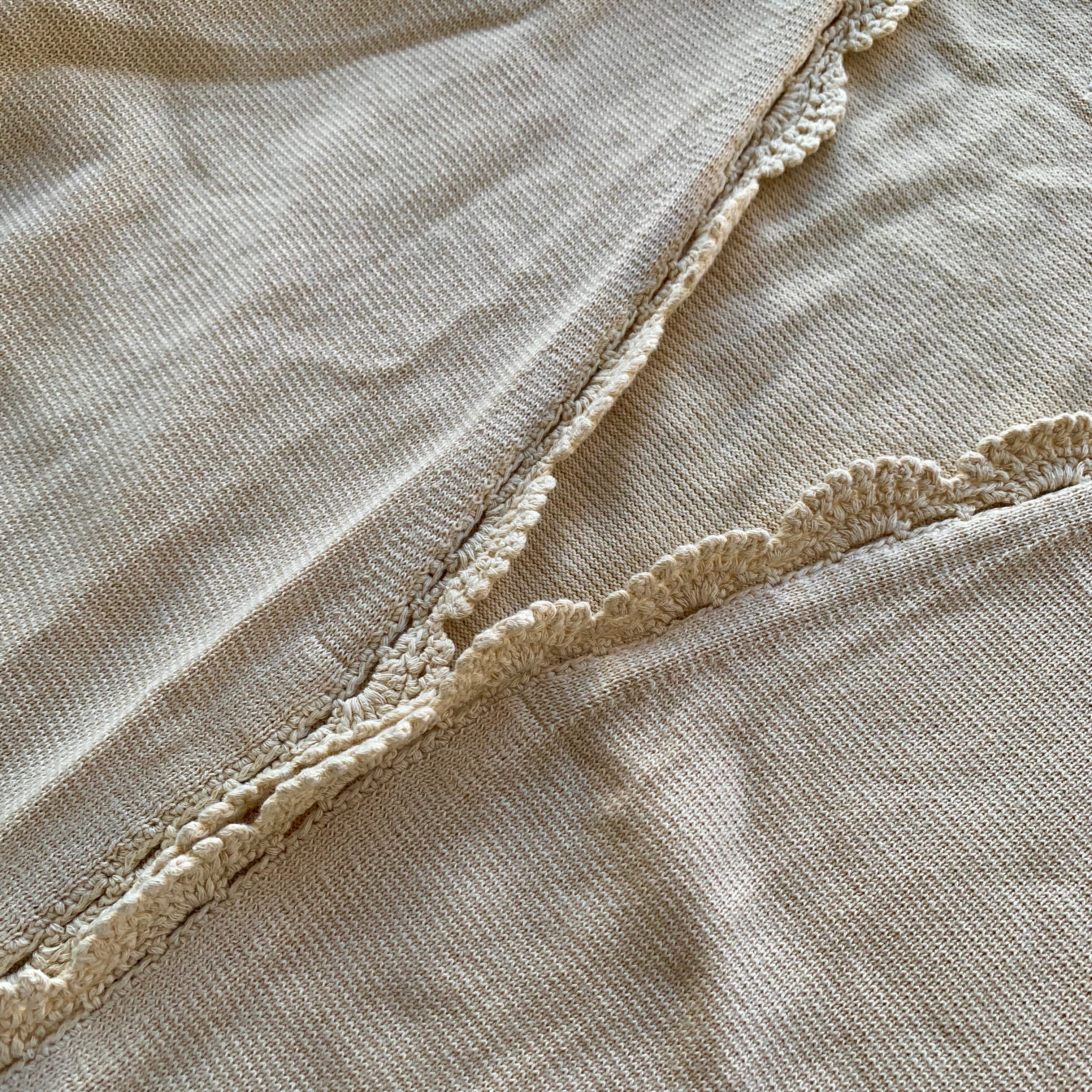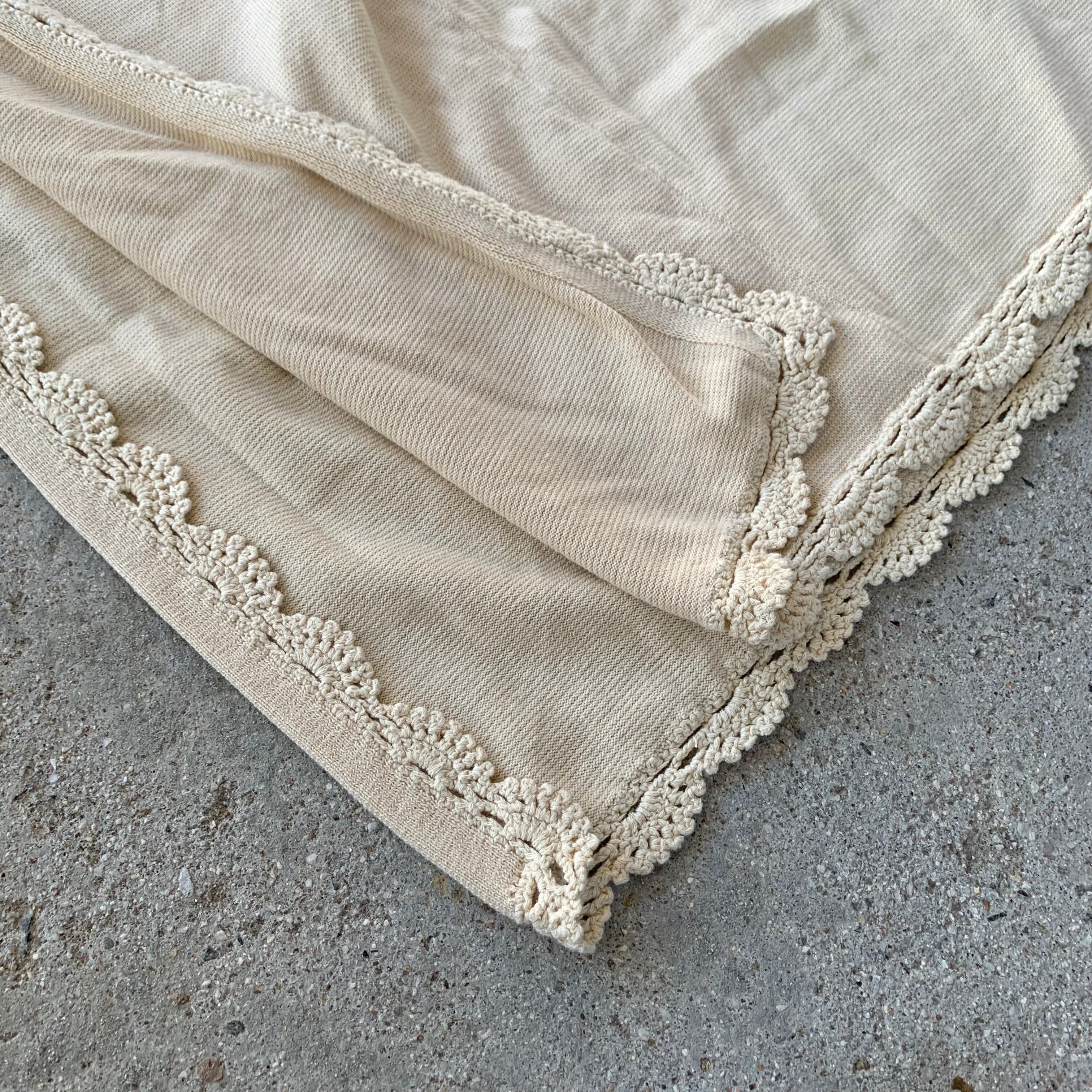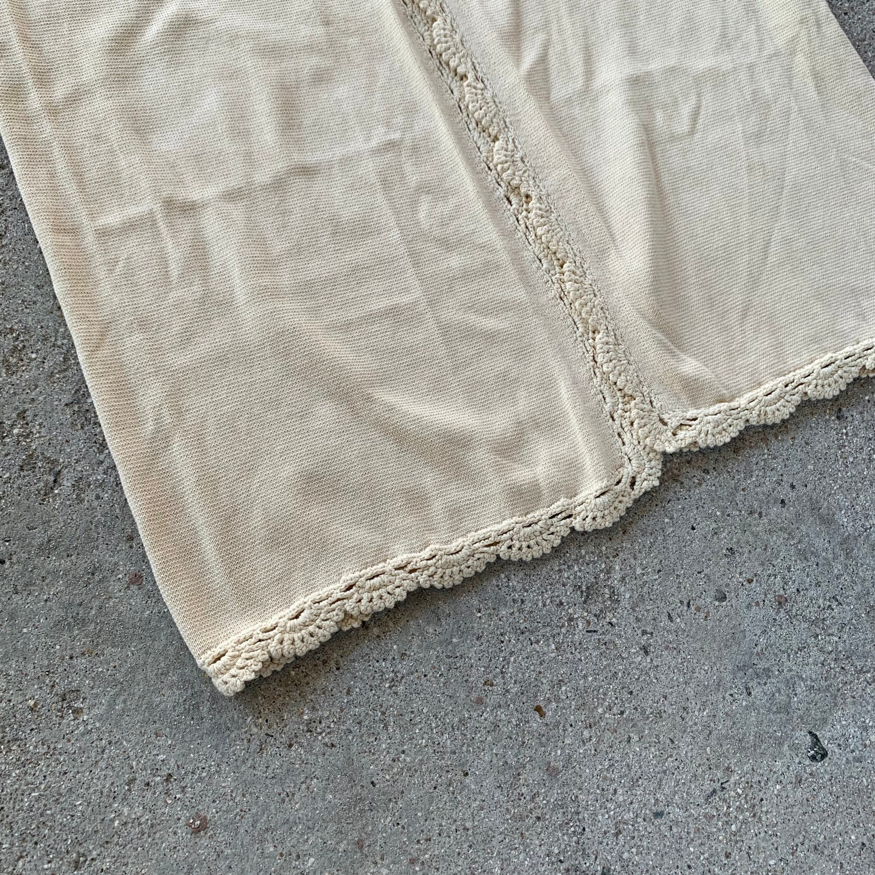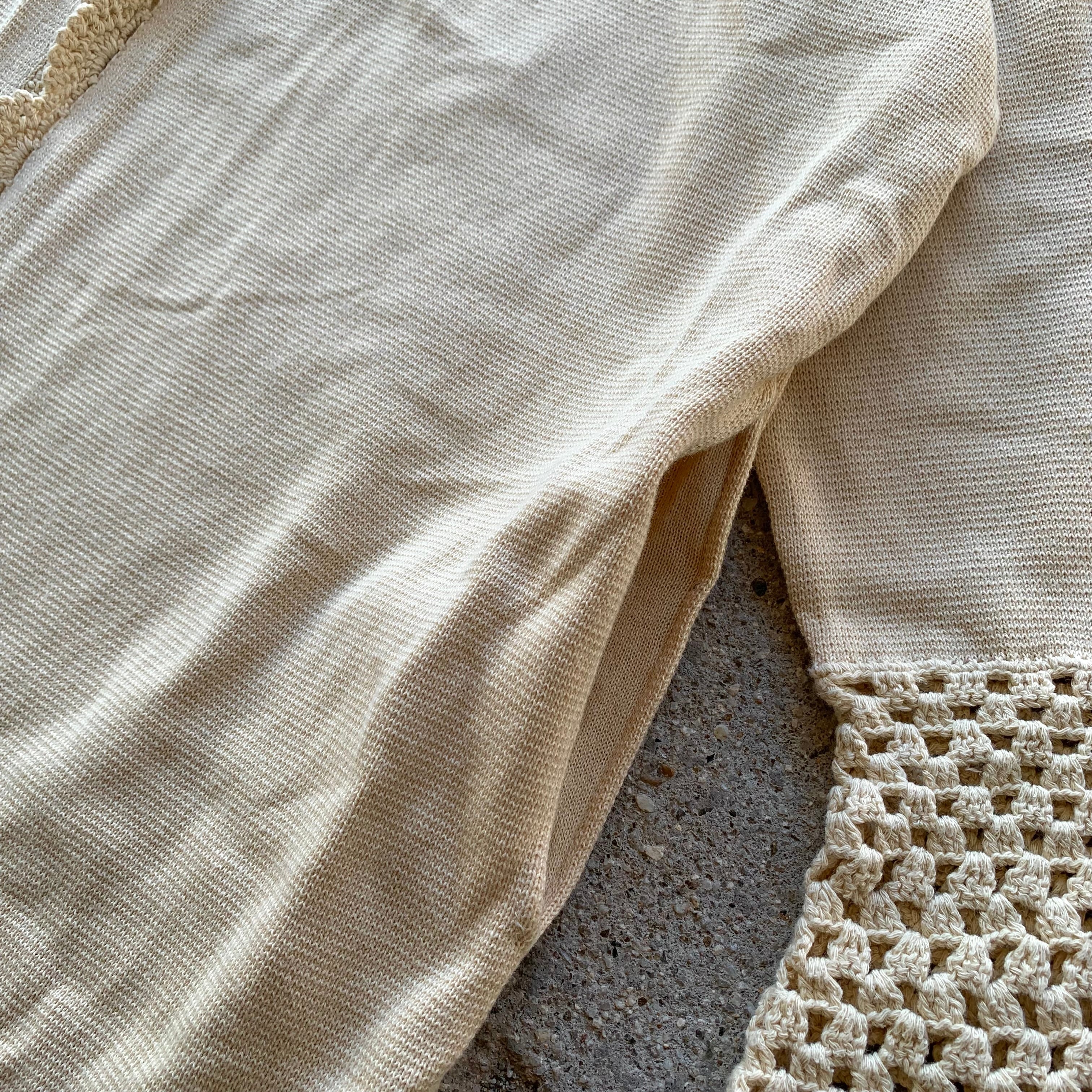 膝下まであるロングコットンニットカーディガンになり、裾口のレース編みデザインが特徴。