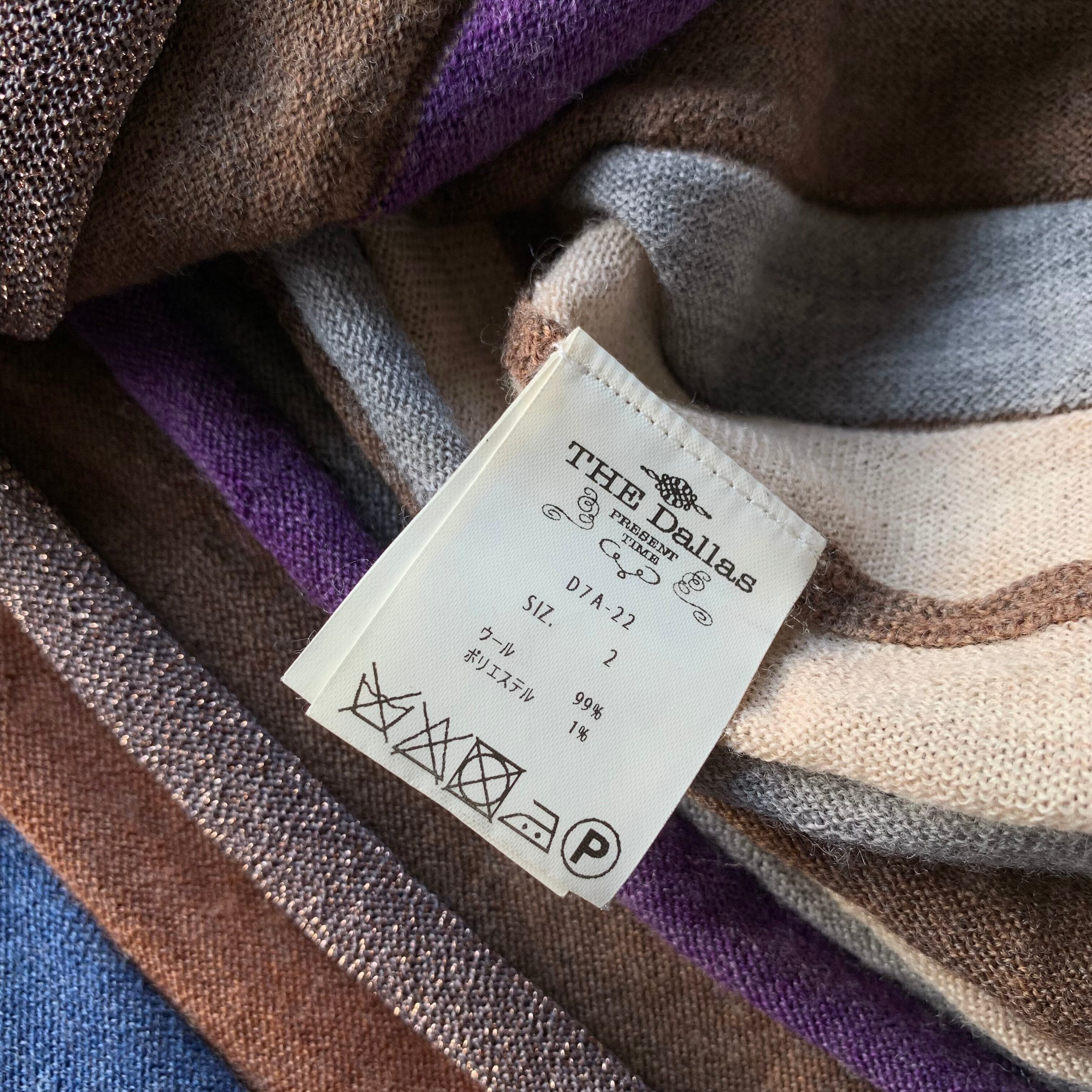 ブラウンベースに落ち着いた配色のマルチカラーニットでシャツやTシャツ、スウェットまで幅広く合わせが効きます。クリース仕様の生地繋ぎとなり、手の込んだダラスらしい洋服です。
