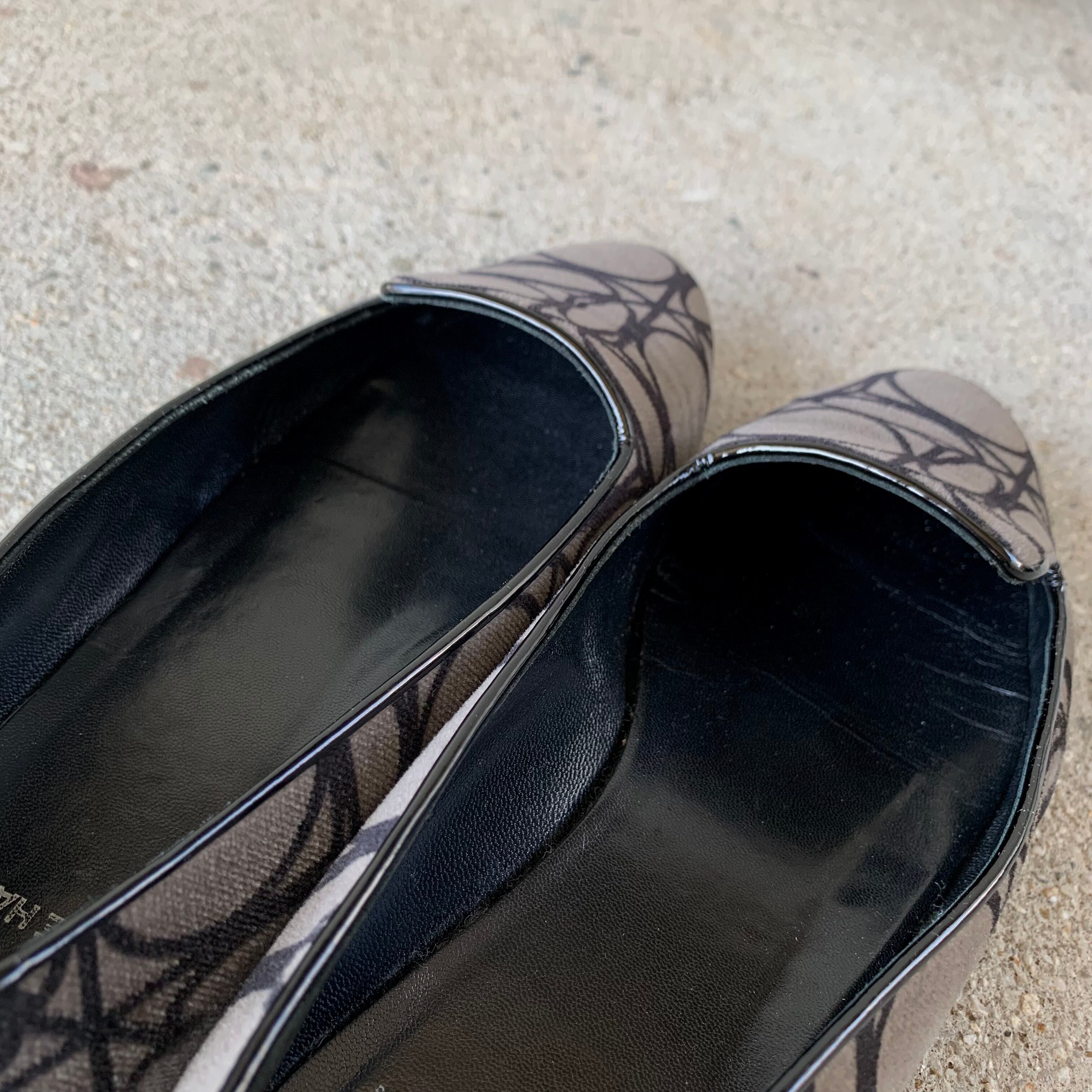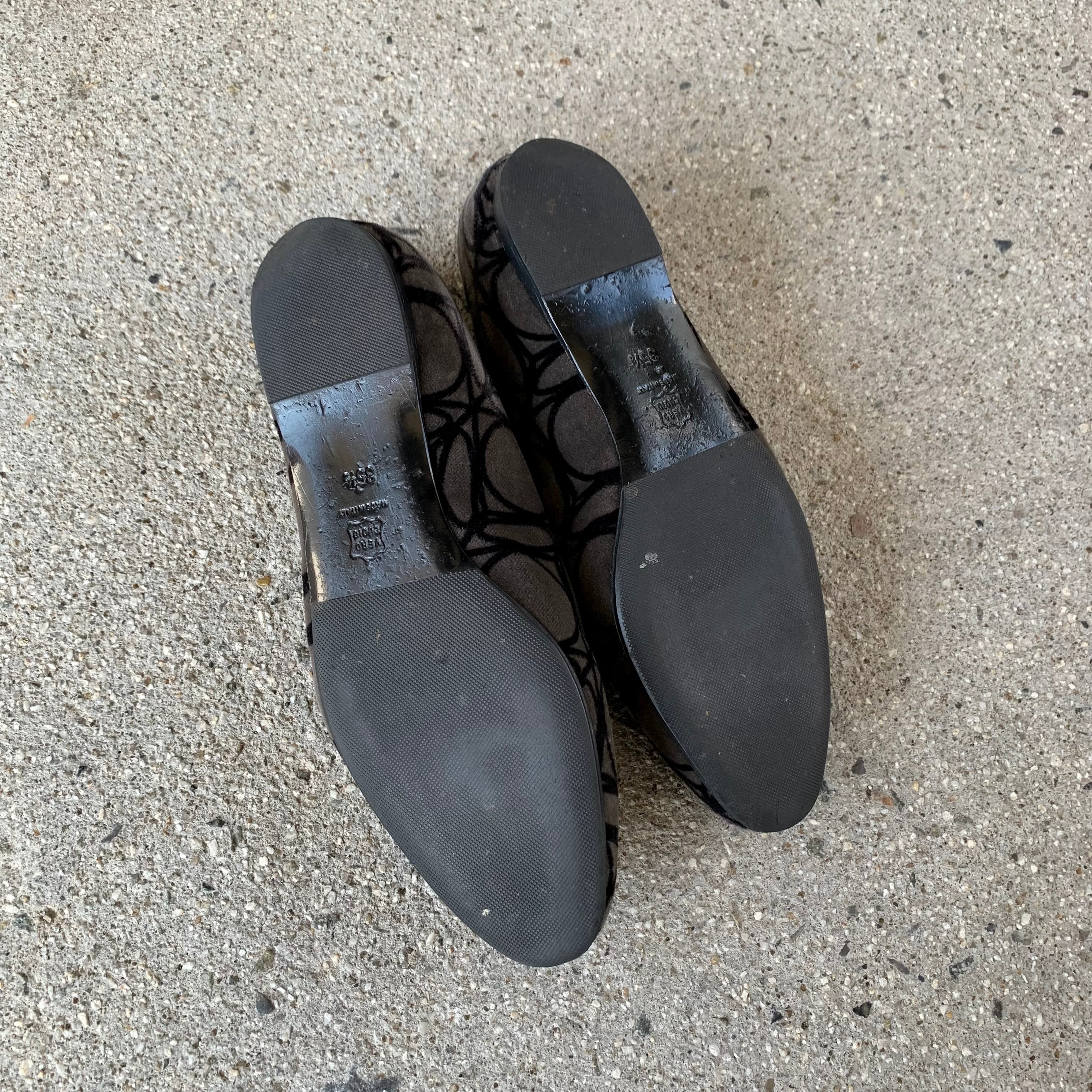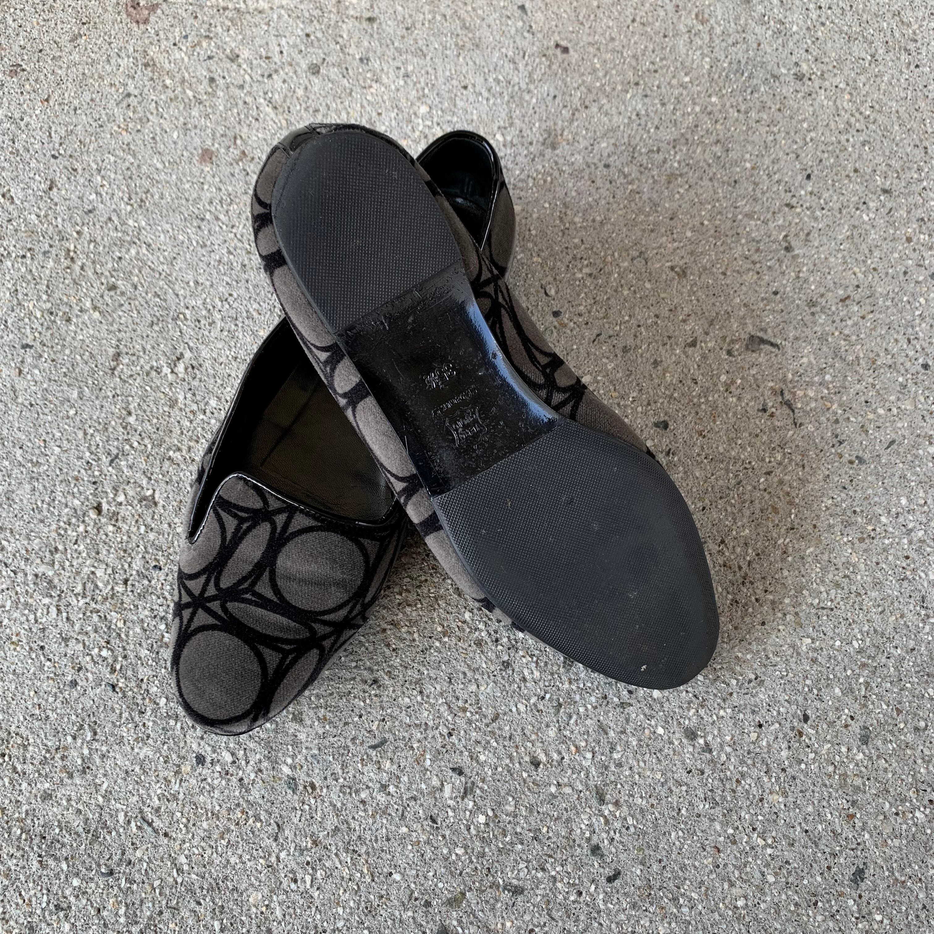 マットなベロア素材で柄を描いた独創的なフラットシューズ。
