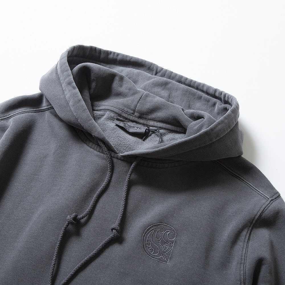しっかりとした厚みのある12.3ozコットンスウェットの裏起毛プルオーバーフーディ。ゆったりとしたルーズフィットシルエットのサイジングです。ガーメントダイにより色落ち感の表現とソフトな仕上がりで雰囲気あるパーカー。フロントにワンポイントの同色刺繍と、バックに大きなバロック調のVerseプリントパッチ付き。この商品はガーメントダイ加工によりユーズド感のような風合いがありますが商品の表現になりますので予めご了承ください。