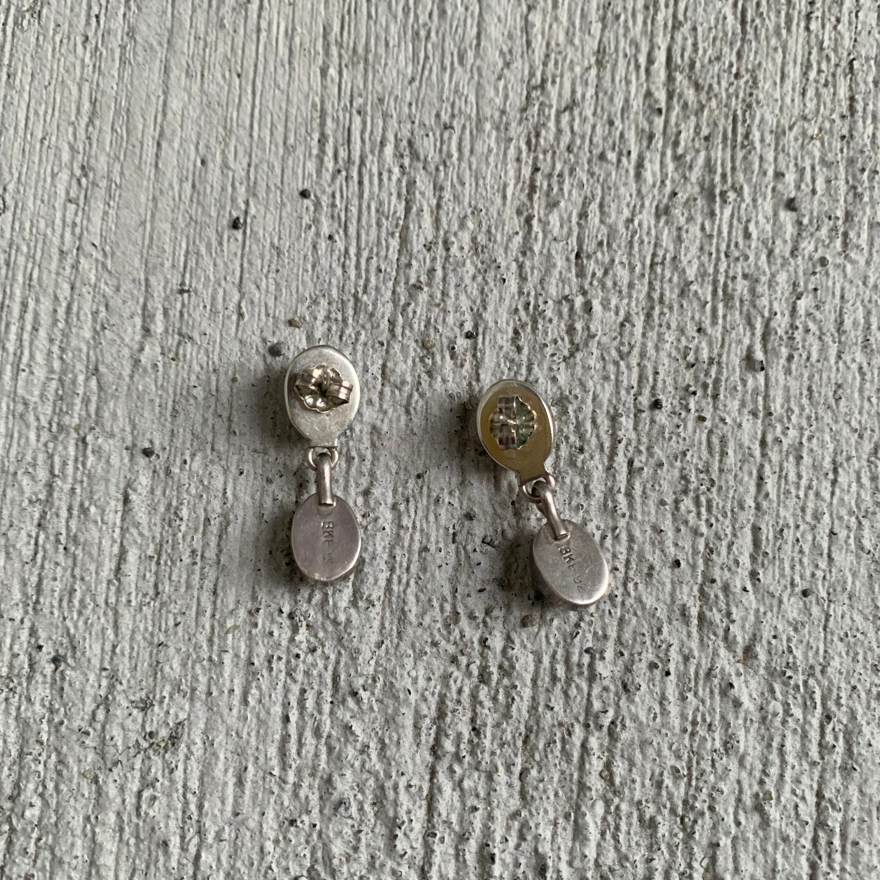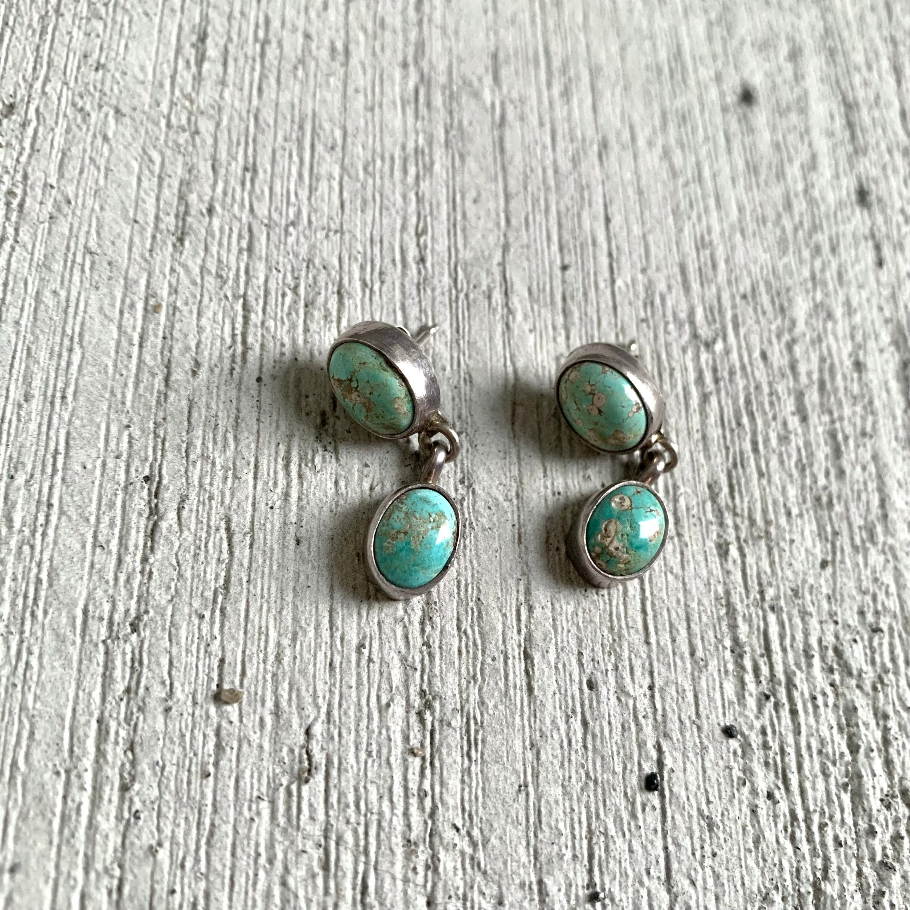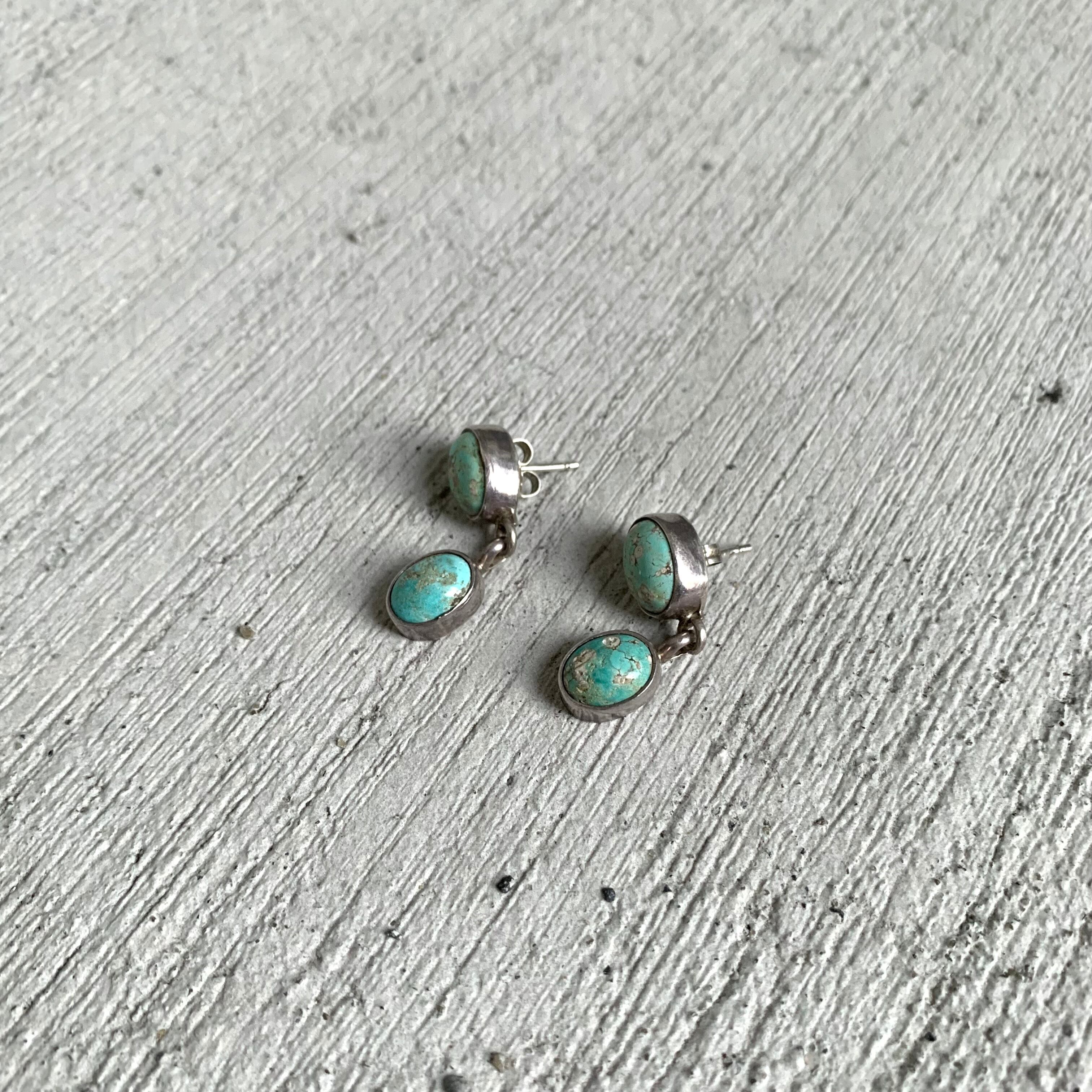 ナバホの作品でデザイナーは不明、大きめなターコイズをあしらったドロップ型スタッドピアス。混ざったターコイズの色味とやや重みがあり、高級感あるインディアンジュエリー。
